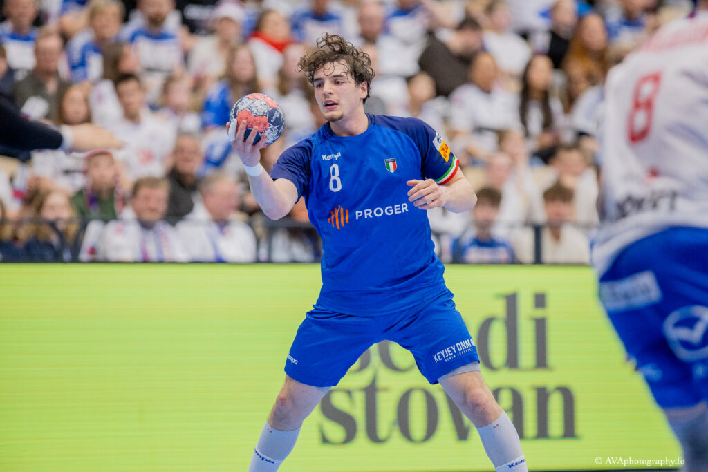 L’avvio di gara è contraddistinto da una nota amara in casa Italia, con l’infortunio dopo meno di un minuto per il mancino Juan Cuello: brutta caduta in elevazione e partita finita anzitempo per il terzino destro della Nazionale, le cui condizioni saranno monitorate nelle prossime ore. Dentro al suo posto Jack Savini, tra i migliori di una partita assieme ai gemelli Marco (4) e Simone Mengon (7). L’Italia fa tanto gioco, costruisce (da segnalare il primo gol in azzurro per il 19enne Simon Sirot), ma nel primo tempo paga le troppe imprecisioni dai sei metri: Romei in particolare fa fatica a superare l’estremo difensore faroese Jacobsen e il risultato è di 6-4 nelle battute iniziali. Entrambe le squadre amano i ritmi alti e il gioco atipico, le Isole Faroe con un costante 7vs6 e l’Italia proponendo spesso e volentieri quattro giocatori nei ruoli esterni e rinunciando al pivot. Ne viene fuori una partita ricca di gol (19-17 alla mezz’ora) e soprattutto una ripresa frizzante.