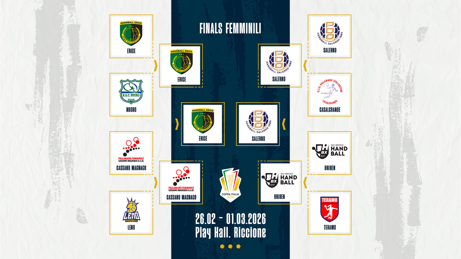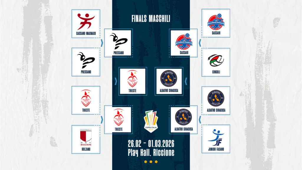 Un inedito che sa di storia e una riedizione che è già una classica. In sintesi: Trieste – Teamnetwork Albatro Siracusa e AC Life Style Erice – Jomi Salerno sono le finali che domani (domenica), al Play Hall di Riccione, assegneranno l’edizione 2026 della Coppa Italia. Donne alle 16:00 per un remake di quella che è già stata finale un anno fa e poi ancora ultimo atto per Scudetto e Supercoppa. Poi, alle 18:00, la finale degli uomini che metterà di fronte non solo due squadre, ma anche due città che hanno scritto pagine indelebili di storia della pallamano italiana. Un dato storico: era il dicembre 1996 e la storica Ortigia superava Trieste sul neutro di Bologna; domani – quasi 30 anni dopo – Siracusa e la città giuliana saranno ancora una contro l’altra in un contesa dai tratti epici. E tutto accadrà in diretta dal palasport romagnolo su Sky Sport Arena (canale 204) e in streaming su PallamanoTV.